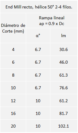 Empañe pequeño, el máximo corte radial, no debe superar el 20% del diámetro de la fresa.