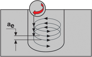 La herramienta se programa con un recorrido continuo en espiral que avanza en dirección radial para mecanizar una ranura o un perfil.
