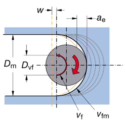 2) Es importante mantener la relación entre el diámetro de la fresa y la anchura de la ranura por debajo del 70% y el paso radial, w, por debajo del 10% de Dc. 3) El avance es constante, sin embargo, el avance del centro de la herramienta, vf, es distinto del avance de la periferia, vfm.