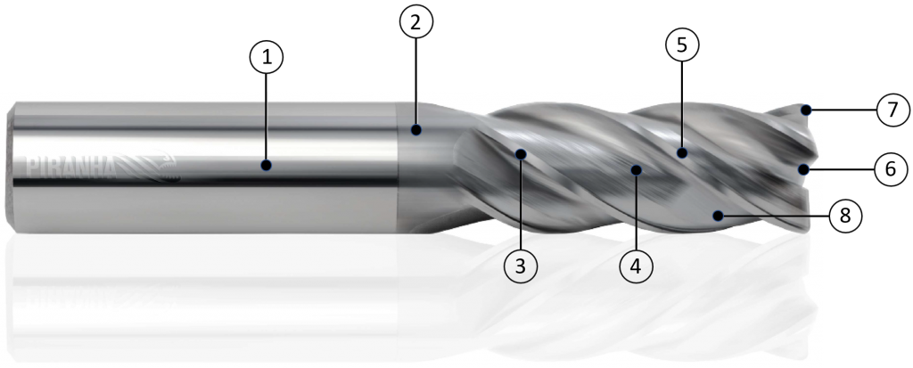 La configuración de doble ángulo de filo de las herramientas PIRANHA permite eliminar el material a una alta velocidad gracias a dos ángulos de incidencia distintos, que quiebran las virutas y evitan el atascamiento en las flautas.