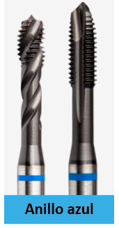 En los machos helicoidales de anillo azul, el chaflán posterior facilita aún más la evacuación de la viruta, reduciendo el astillamiento en los últimos hilos del macho y también reduce el par torsor cuando el giro se invierte.