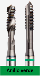 Geometría especial en los machos helicoidales de anillo verde que evita la acumulación de viruta, lo que reduce el riesgo de rotura al invertir el giro.